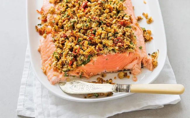 This sundried tomato, lemon and chilli-crusted salmon is the perfect simple yet sophisticated dish to enjoy this summer, especially when served on a white platter like the Teirra Serving Platter.