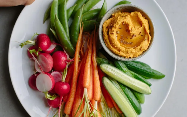 Vegetable crudités, like in this recipe with roast carrot hummus, are stunning served fanned out on a Marble Serving Board.