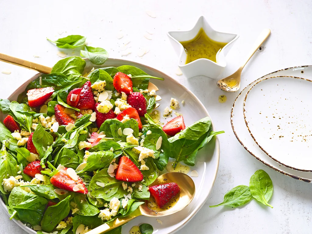 This fresh and colourful strawberry salad with poppy seed dressing is the perfect accompaniment to a summer barbecue meal. The mixture of sweet, sour and salty makes it simply irresistible!