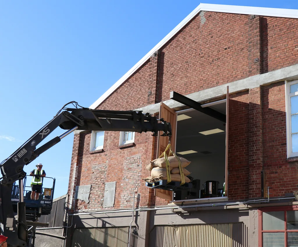 The first batch of beans delivered by a crane into the new OCHO chocolate factory.