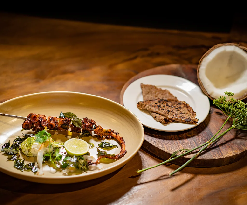 Wood-grilled tandoori octopus with eggplant pickle, coriander yoghurt and turmeric oil, served with homemade flatbread.