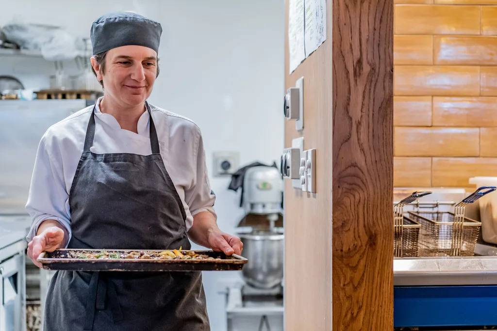 Wood-fired cooking is an integral part of the menu, as is making everything from scratch – from sauces to bread and doughnuts (a big student drawcard). Cooking with fewer ingredients – but utilising more of each ingredient – is important too, both to keep things simple and minimise waste.