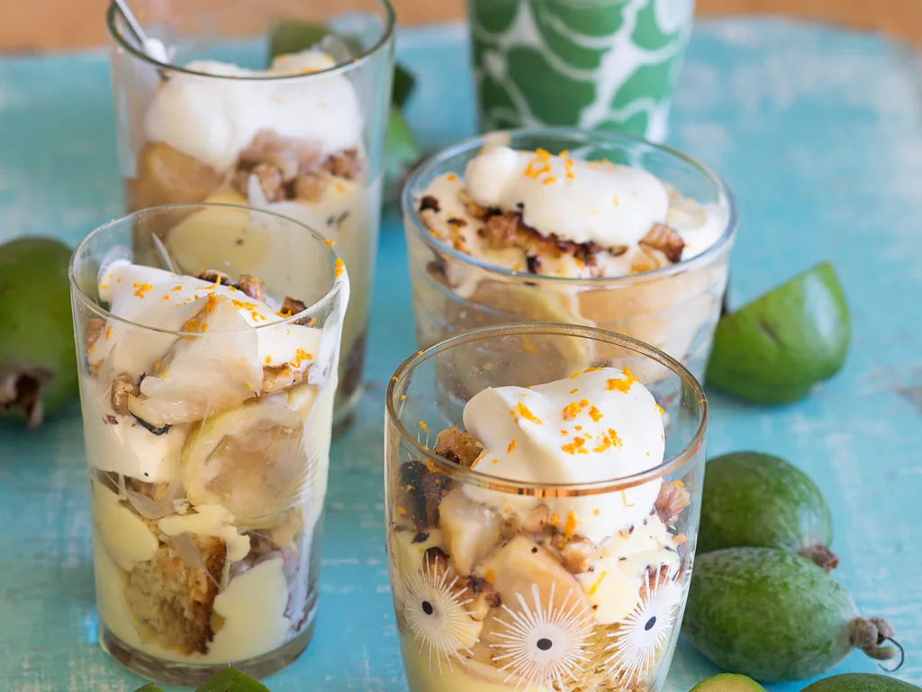Skip the baking and create this irresistible trifle in a snap. Starring sponge cake, crunchy walnuts and homemade custard spiked with ginger, this dessert is the perfect way to enjoy feijoas.