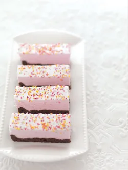 Spread the marshmallow mixture onto the cooled base. Top with the sprinkles. Refrigerate to set before cutting into squares to serve.