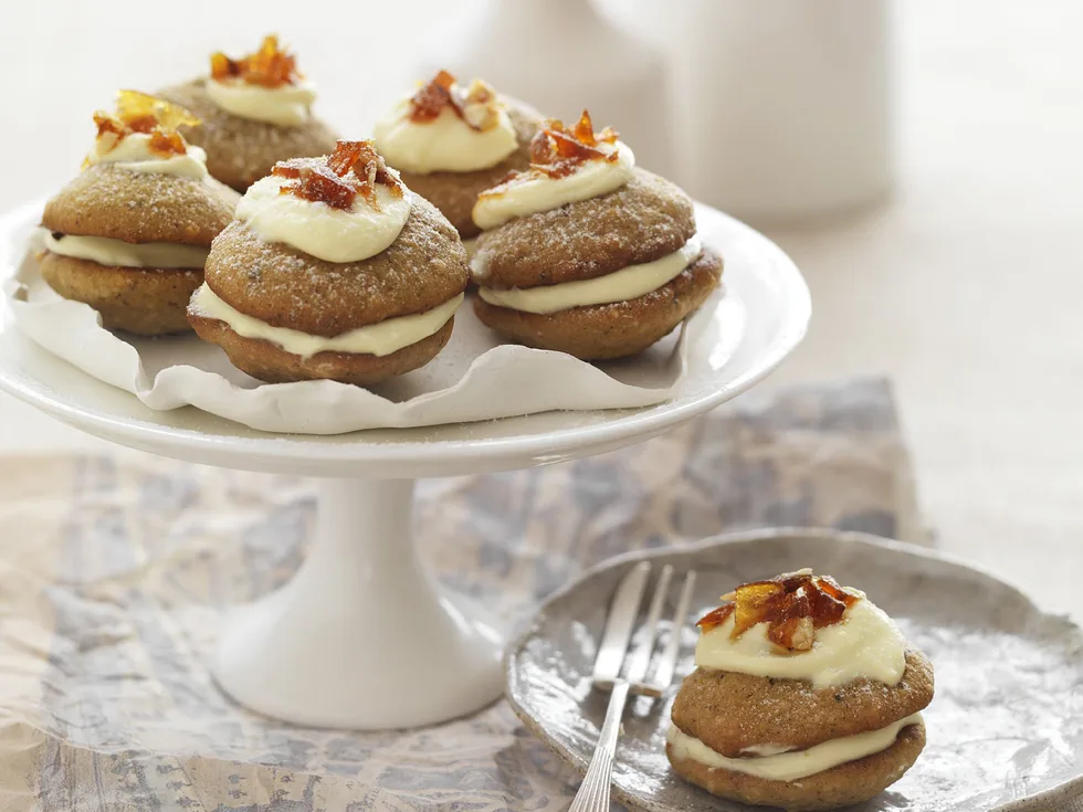 7.Sandwich pies with two-thirds of the butter cream. Top pies with remaining butter cream; sprinkle with buttered hazelnuts. Dust with sifted icing sugar.