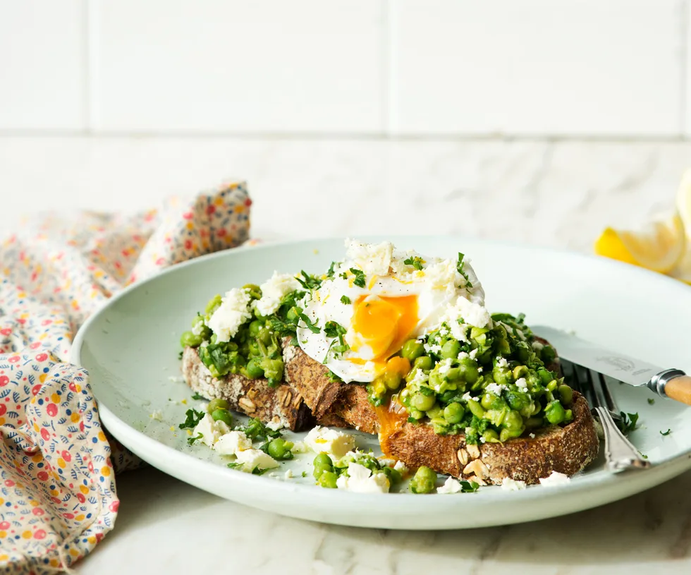 4.To serve, top each sourdough toast with pea mixture, followed by an egg. Crumble over the feta and sprinkle with lemon zest and extra chopped herbs.