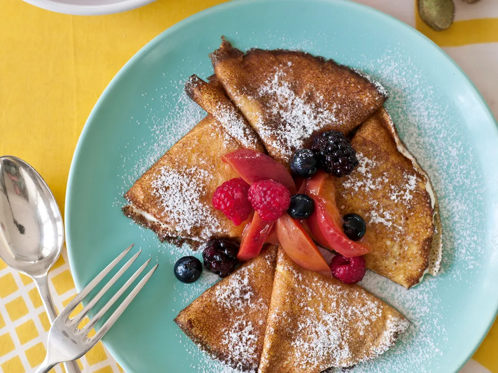 7.Spread the crêpes with yoghurt. Fold in half, then fold again to form triangles. Arrange three to four to a plate and dust with icing sugar. Spoon fruit and juice over and around the crêpes. Serve immediately.