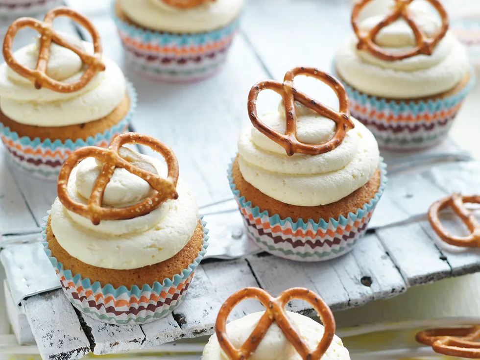 5.Spoon butter cream into a large piping bag fitted with a large plain tube. Pipe large swirls of butter cream onto cold cakes; top with pretzels.
