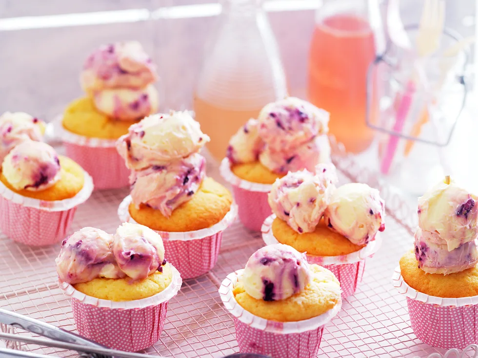 2.Meanwhile, make blackberry swirl frosting: Crush blackberries very well with a fork. Beat cream cheese, sifted icing sugar, lemonade and rind in a small bowl with an electric mixer until smooth. Lightly fold crushed berries through cream cheese mixture to create a swirled effect (don’t over-mix or you will lose the swirl). Place frosting in the freezer for a few hours or until firm.tip Use a clear, carbonated lemonade for this recipe.