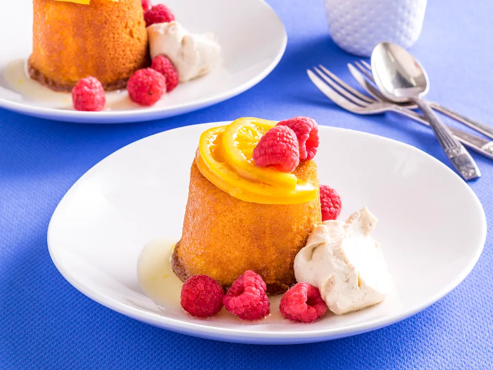 6.Serve cakes drizzled with syrup and accompanied with orange slices, cinnamon mascarpone and raspberries.