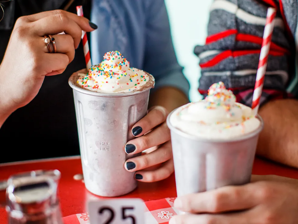 2.Beat cream and icing sugar in a small bowl with an electric mixer until soft peaks form. Spoon into a piping bag; pipe onto thickshakes. Sprinkle with 100’s and 1000’s.