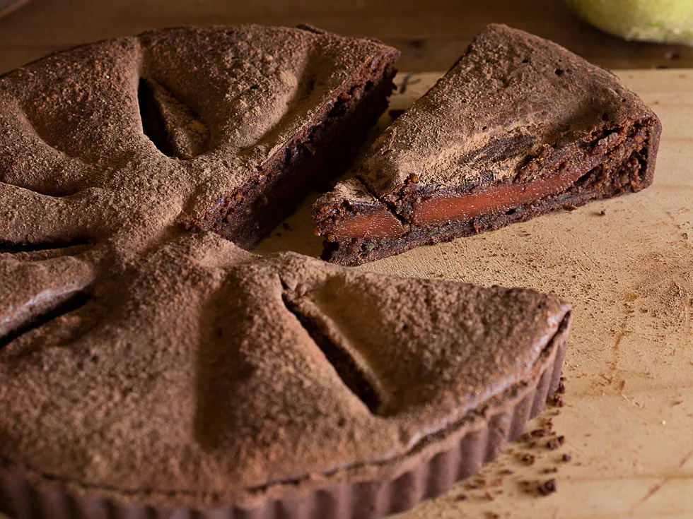 11.Place a third of the chocolate and almond cream on the base of the tart shell.Top with cooked quince wedges and dot the remaining chocolate and almond cream on top. Return the tart to the oven for 50–60 minutes; this time will depend on your oven, but you need to make sure that the chocolate and almond cream is cooked in the centre.