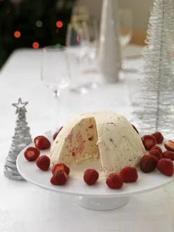 4.Remove the ice cream from the freezer and turn onto a serving platter. Garnish with strawberries or raspberries.
