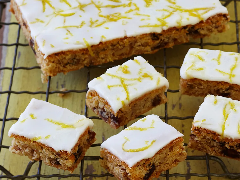 Preheat oven to moderate, 180°C. Lightly grease an 18 x 28cm slice pan. Line base and sides with baking paper, extending sides 2cm above pan edge.