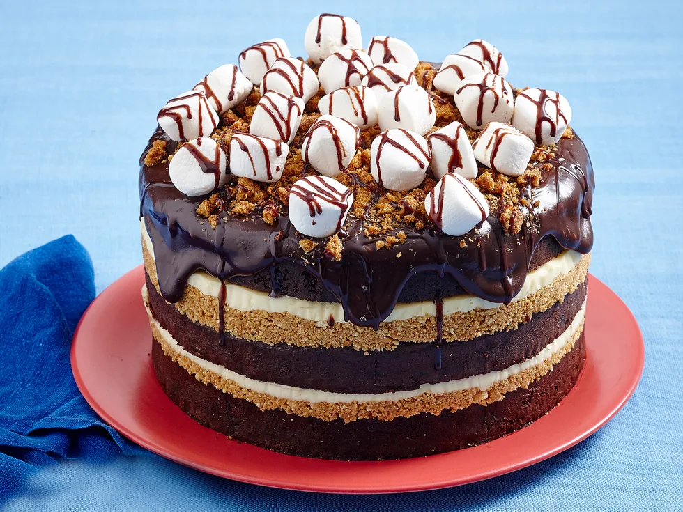 8.Reserve 1/4 cup of fudge sauce. Pour remaining over top of cake, allowing it to drizzle down sides. Roughly crush reserved biscuits. Sprinkle over top with extra marshmallows. Drizzle with reserved sauce.