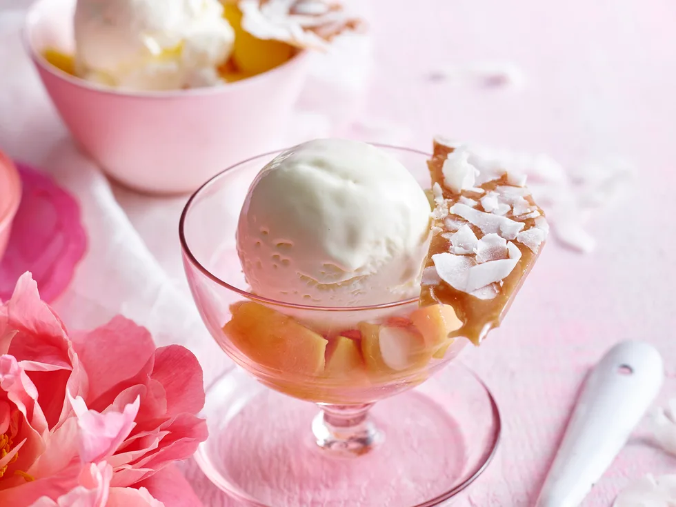 3.Serve the freshly-churned frozen yoghurt with the mango, sprinkled with Coconut Brittle.