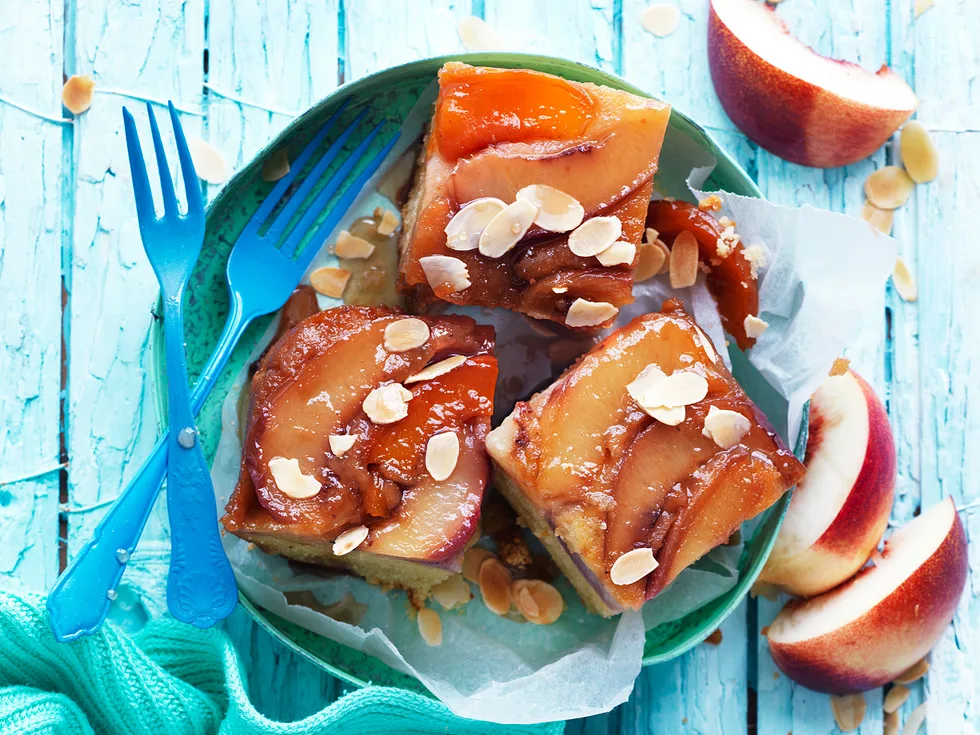 2.Combine chopped butter and brown sugar in a small saucepan, stir over low heat until smooth; pour into base of cake pan. Place nectarine wedges, cut-side down, over caramel mixture.