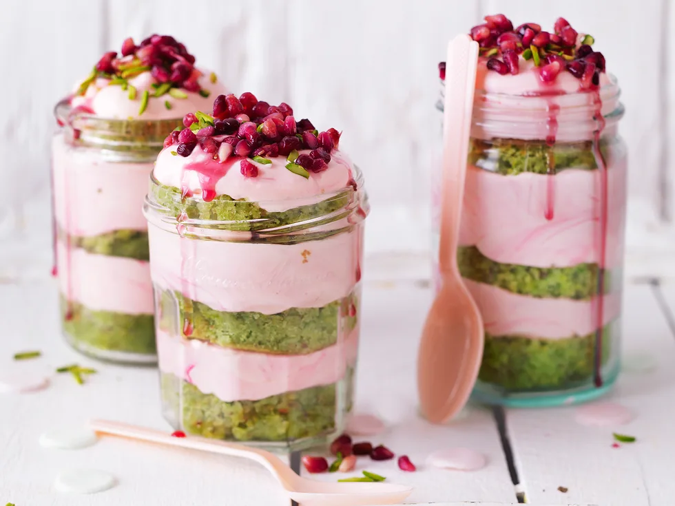 2.Process pistachios until fine. Beat butter and sugar in a small bowl with an electric mixer until light and fluffy; beat in eggs, one at a time. Transfer mixture to a large bowl; stir in ground nuts, sifted flour and buttermilk, in two batches. Tint mixture a pale green with food colouring. Divide mixture evenly into jars.