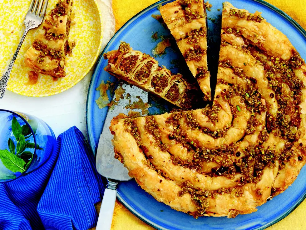 2.Process pistachios, almonds and pecans in a food processor until finely chopped. Add sugar, cinnamon, allspice, zest, juice and vanilla; pulse to combine. Set aside about 1/8 cup of nut mixture, to decorate.