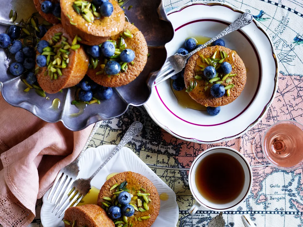 5.Serve warm friands topped with warm syrup and blueberries.