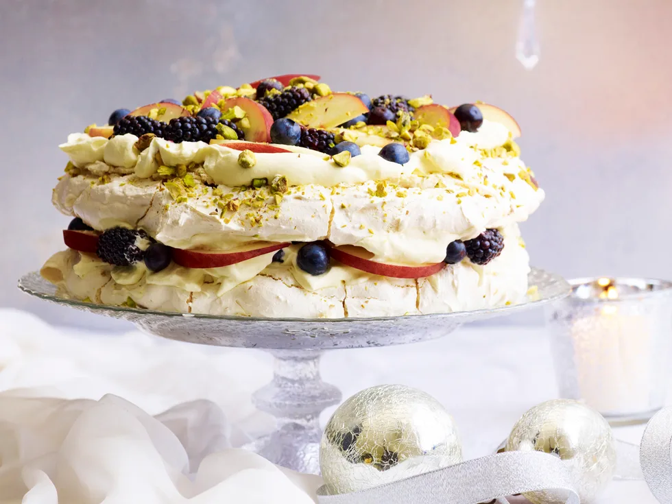 8.Place a meringue disc on serving plate. Spread with half the cream, then top with half the peaches and berries. Top with remaining meringue, cream, fruit and nuts.
