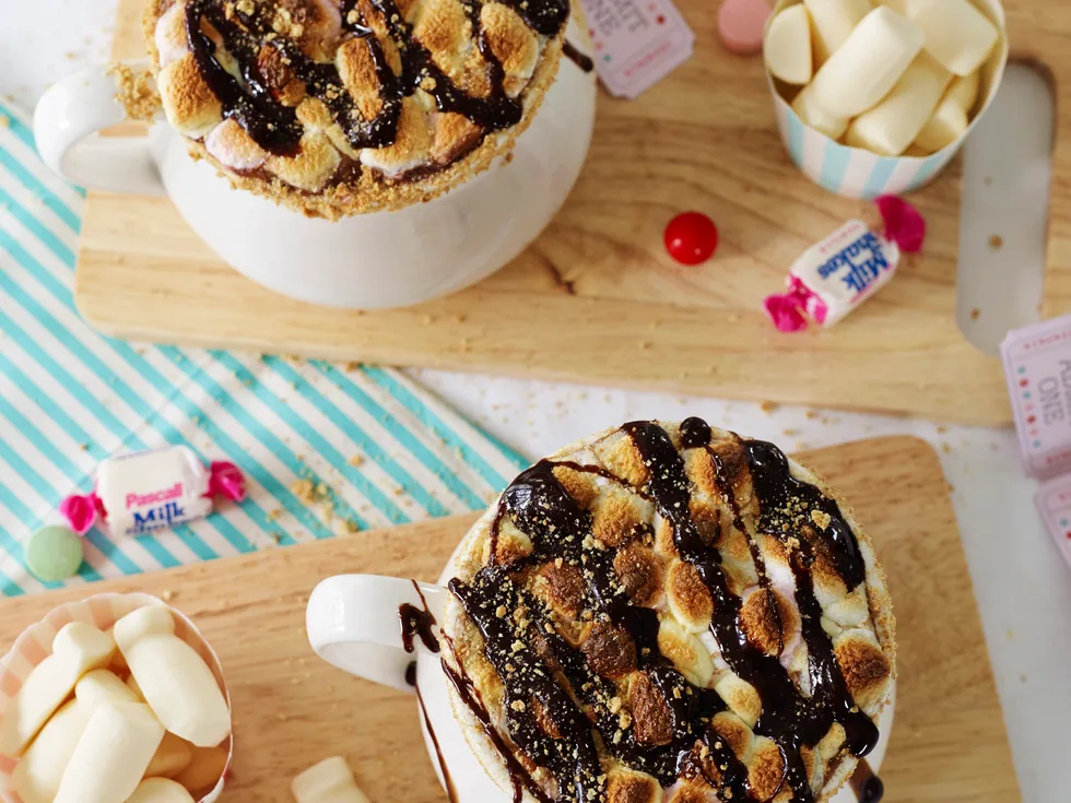 4.Carefully place under grill and toast until marshmallows are golden. Remove mugs to plates. Drizzle with chocolate syrup and sprinkle with remaining biscuit crumbs. Serve.
