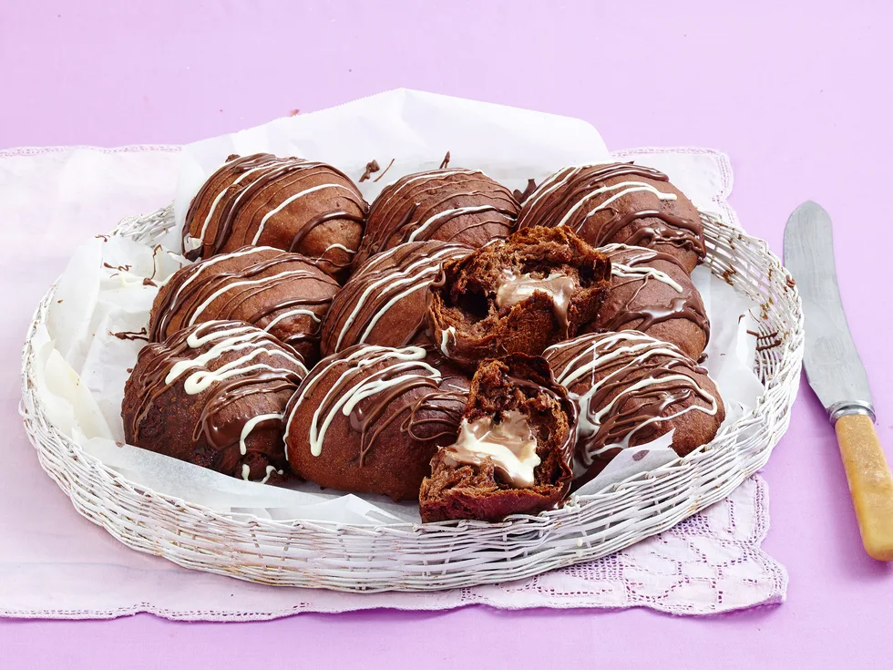 1.Sift flour, cocoa and salt into a large bowl. Stir in sugar and yeast. Make a well in the centre. Gradually add combined milk, egg and butter, stirring well until combined.