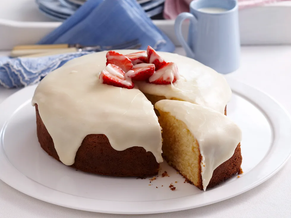 6.Make vanilla icing: Sift icing sugar into a bowl. Add butter, water and vanilla. Beat well until a smooth, spreadable consistency. Spread over cooled cake. Top with sliced strawberries if liked. Store in an airtight container.
