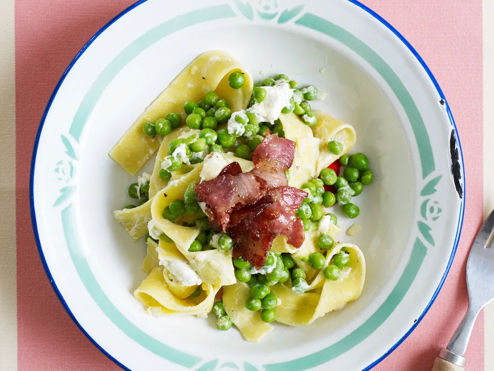 6.Drain pasta, reserving a little more pasta water. Tip pasta into a heated bowl and toss through 2 Tbsp butter and a few cubes of goat’s cheese. Add peas and shallots, scraping in all the buttery juices, and the remaining goat’s cheese. Toss well, adding a little reserved pasta water to loosen everything if necessary. Top with pancetta and serve.