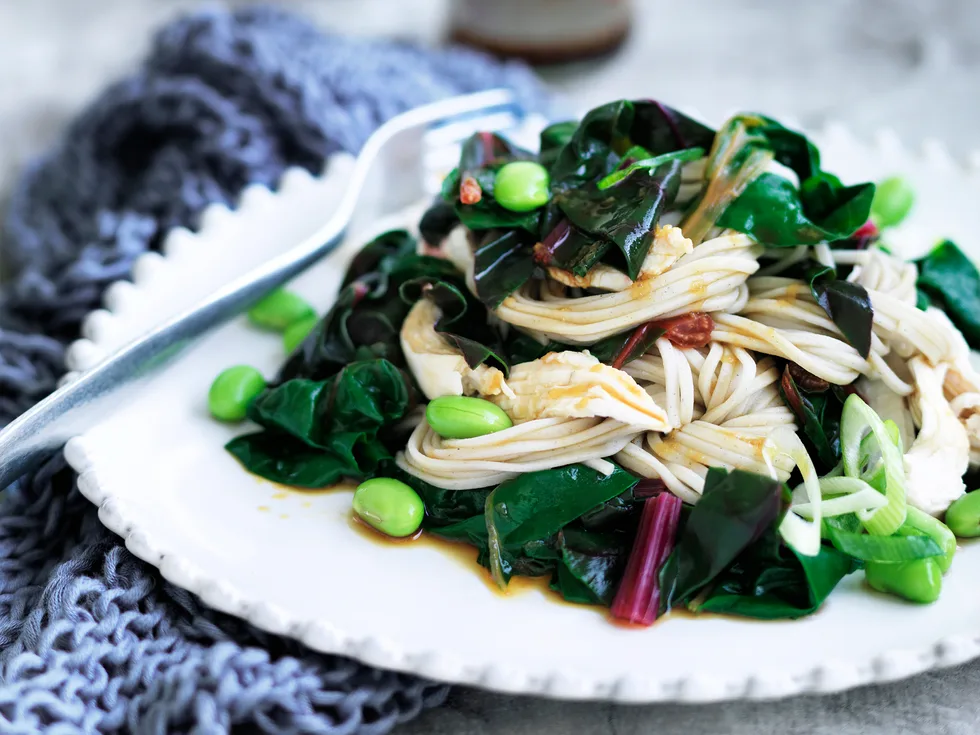 2.Return poaching liquid to the boil. Add noodles; cook for 3 minutes. Add beans and chard to pan; cook for 1 minute. Drain; return noodle mixture to pan.