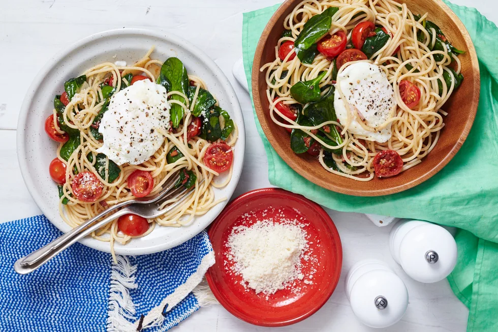 4.Drain pasta and return to pan with bacon mixture. Season to taste and toss well. Serve topped with parmesan and poached egg.