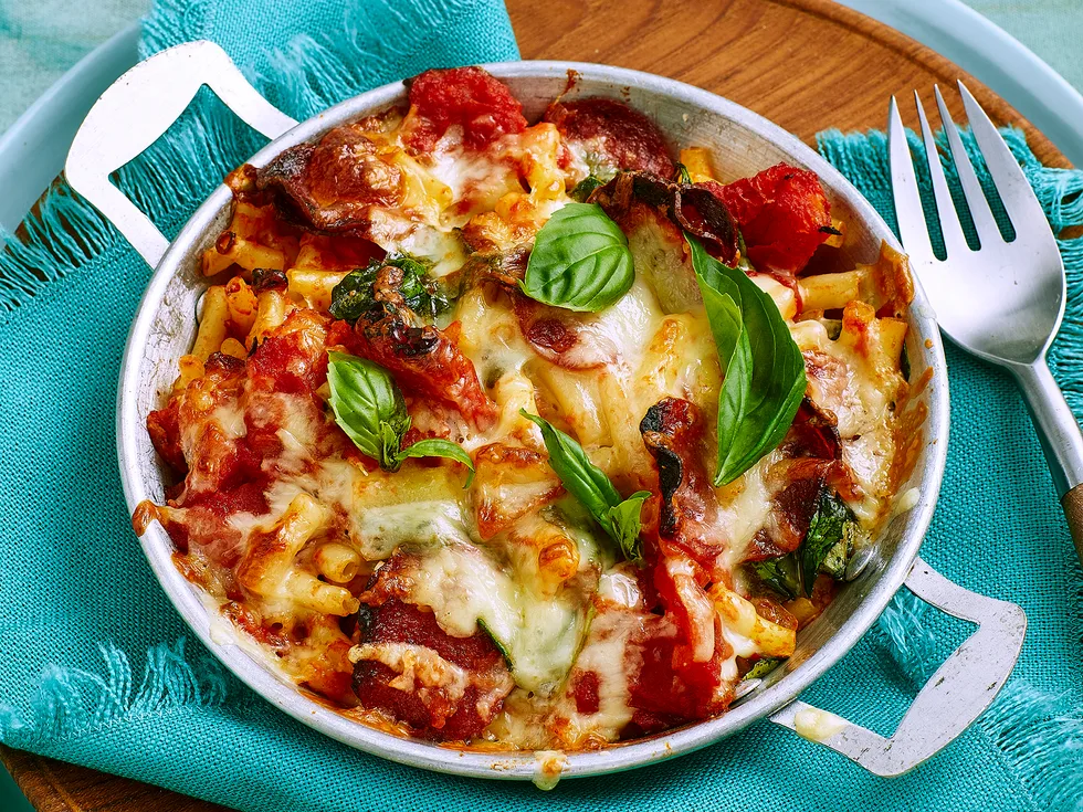 5.Bake 12-15 minutes, until cheese melts and is golden. Scatter with extra basil, to serve.