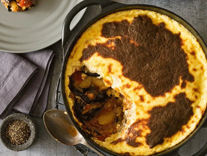 5.Preheat oven to 190°C fanbake. Assemble the moussaka in a buttered 2.5 to 3-litre casserole. Layer potatoes, a seasoning of salt, fried eggplant, then tomato sauce until all ingredients are used up. Beat egg into cheese sauce and spoon on top of casserole. Bake for 30 minutes, until puffed and golden.