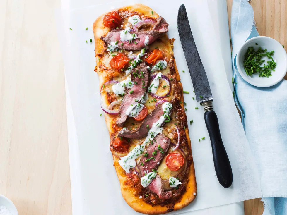 7.Top with steak, add a drizzle of horseradish cream and scatter chopped herbs over the top. Season with salt and pepper.