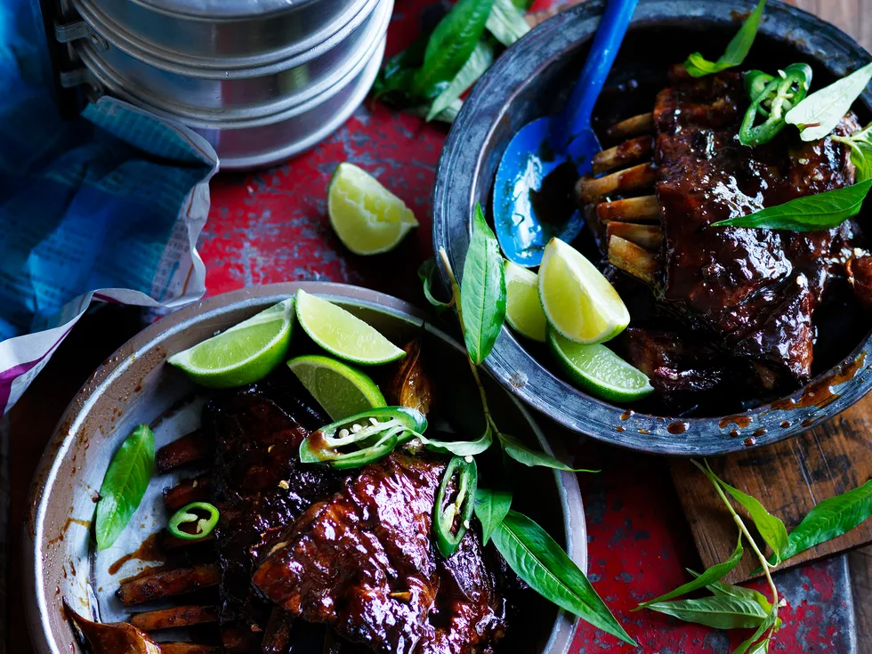 6.Scoop off solidified fat from cooking liquid; discard. Place 2 cups of the cooking liquid in a deep frying pan (discard remaining liquid) over high heat. Add ribs; cook 10 minutes, turning occasionally or until sauce boils and reduces, and ribs have warmed through. Top with mint and chilli; serve with lime.