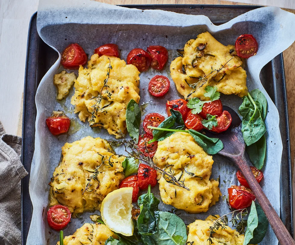 4.Divide the mixture into 6 portions, about 2cm thick, and place on the prepared tray. Lightly brush with oil and bake for 10 minutes. Scatter over the tomatoes, thyme and a drizzle of oil, roasting for a further 15 minutes or until the tomatoes have collapsed and the cakes are golden.