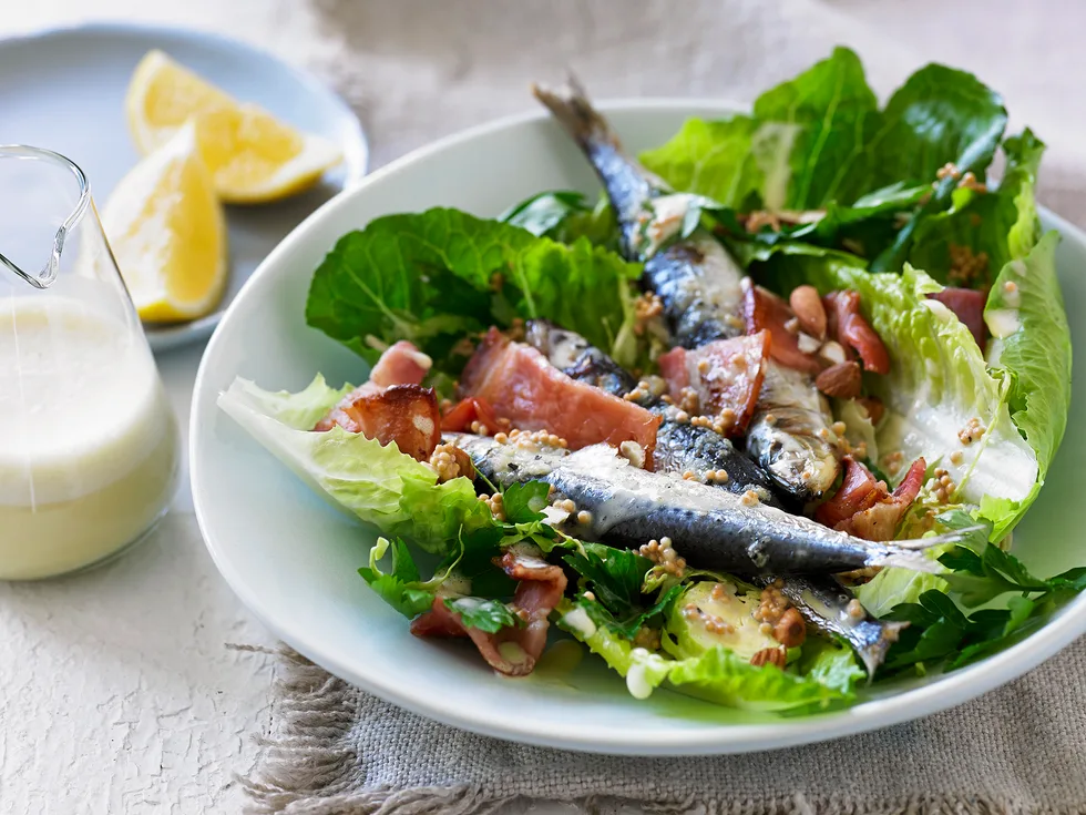5.Make dressing: combine all ingredients into a bowl; whisk until emulsified. Top the lettuce mix with the sardines and bacon and drizzle the dressing over the salad. Serve warm with lemon wedges.