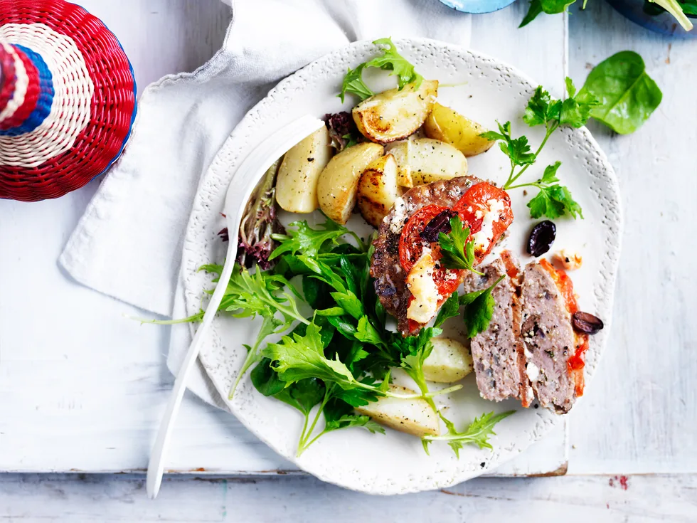 3.Cut the tomato into 12 slices. Choose six large tomato slices; place on top of the mince with half the fetta and olives. Top with remaining mince; press mixture down. Top meatloaves with remaining slices of tomato, fetta and olives. Drizzle with the oil.