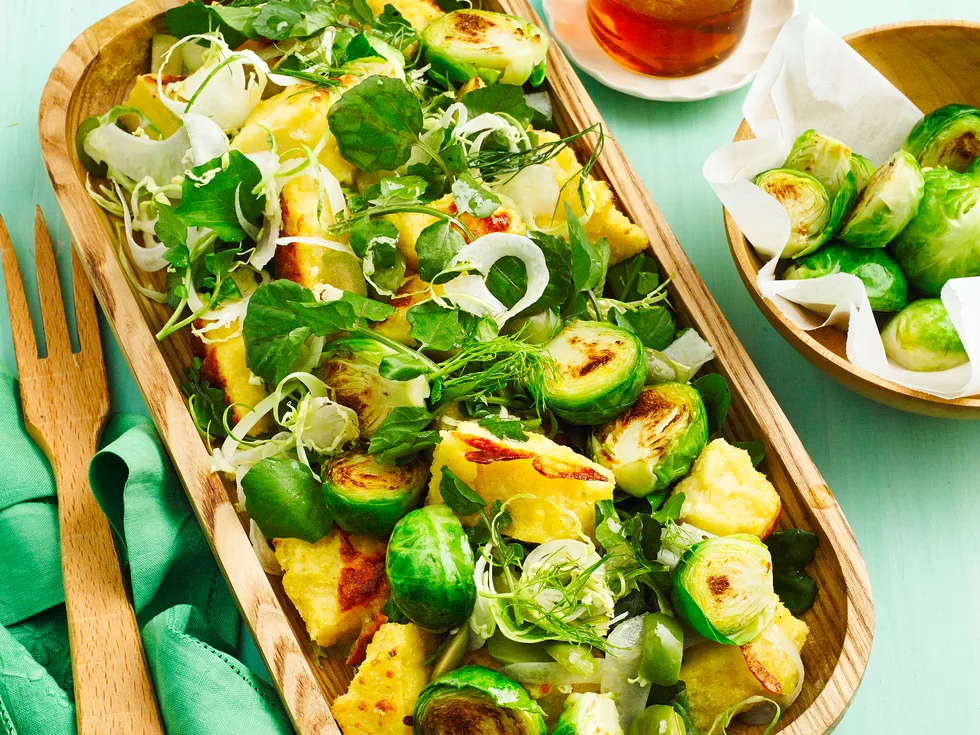 7.In a large bowl, combine polenta, sprouts, fennel, fennel fronds, watercress and olive. Drizzle with dressing to serve.