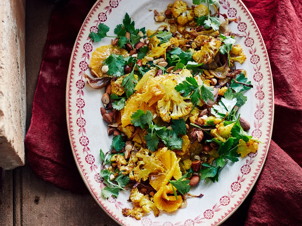 8.Put the roast vegetables, almonds, herbs and orange slices into a bowl and gently fold together. Season to taste. Transfer to a serving plate.