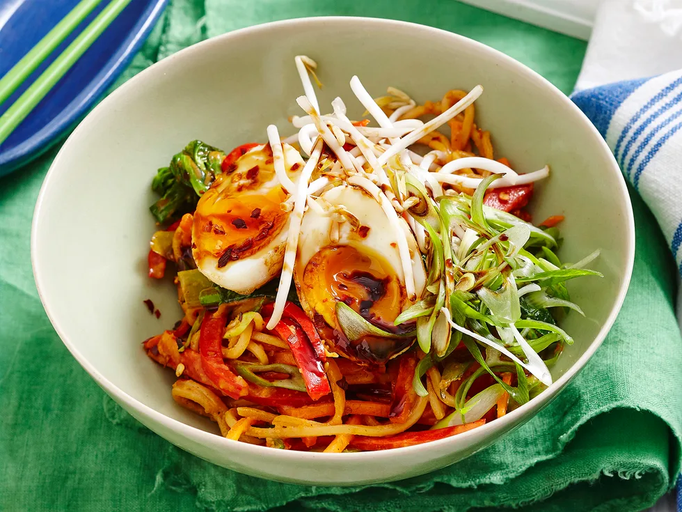 2.In same wok, stir-fry capsicum, carrots and white part of onions, for 1-2 minutes. Add noodles with satay sauce and chilli flakes. Stir-fry for 3-4 minutes.