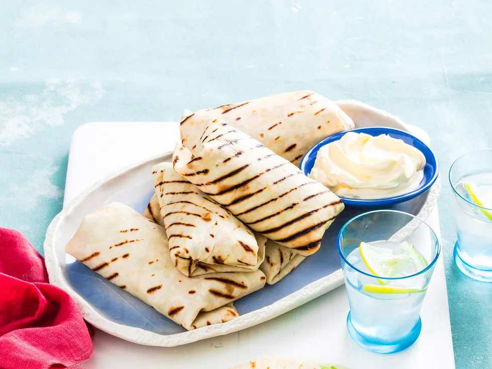 3.Warm the tortilla wrap in the oven, then place some lettuce and guacamole on top. Push the chicken pieces off the skewers and into the wrap. Drizzle with the yoghurt, roll up and serve.