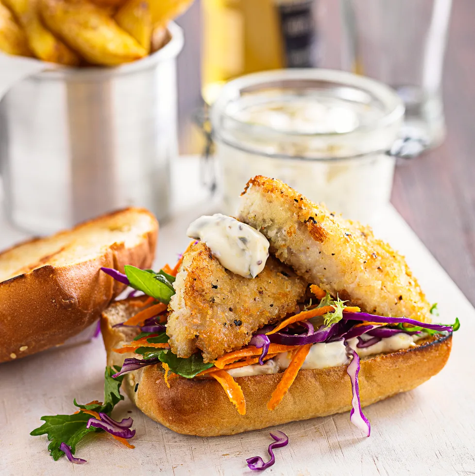 7.Spread the buns generously with the flavoured mayonnaise and top with salad and fish.