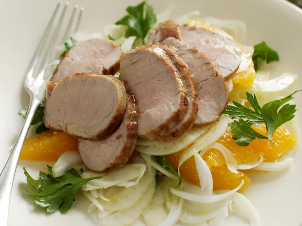 2.Meanwhile, combine fennel, orange segments, onion and parsley in a bowl. Drizzle with combined olive oil and reserved orange juice. Toss to coat.