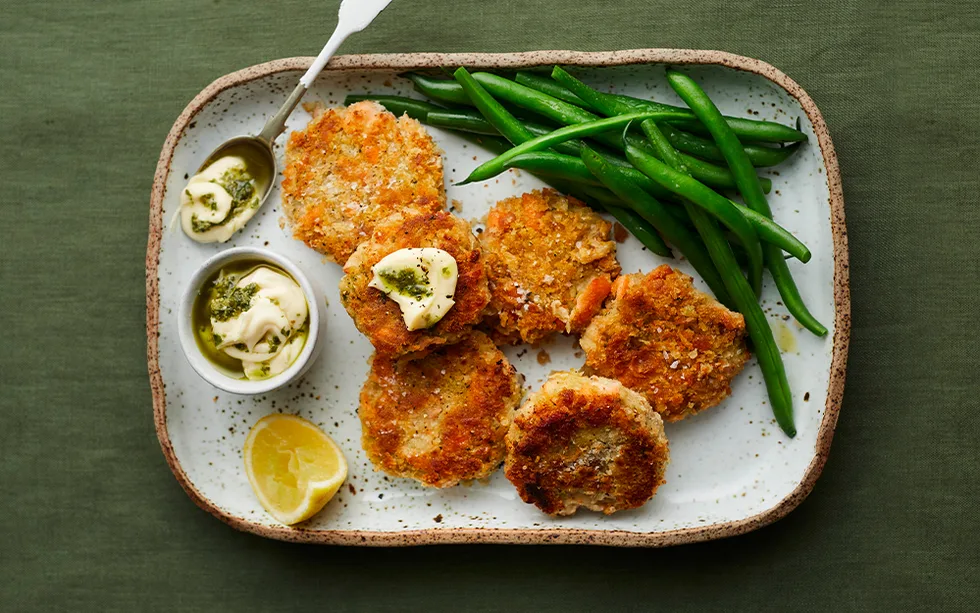 1.Place beans, pesto and mustard in a medium bowl, crushing with a fork until mostly smooth. Add salmon and half the breadcrumbs. Season and mix well to combine.