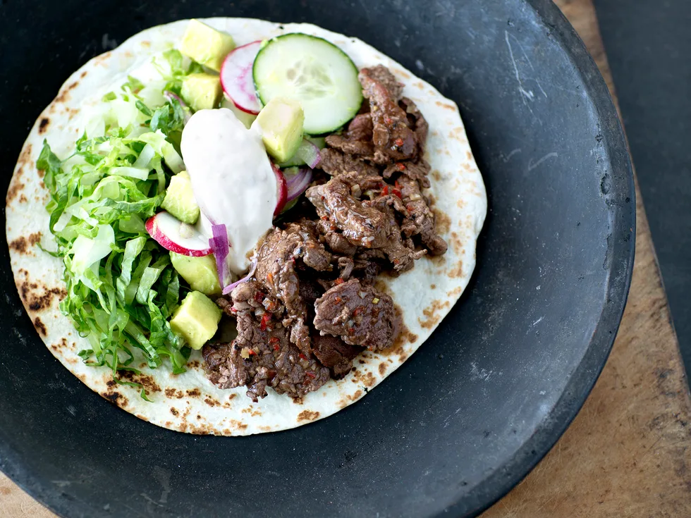 7.To serve, place meat mixture on one side of each tortilla, salad on the other side. Scatter lettuce on top and add a big dollop of horseradish sour cream.
