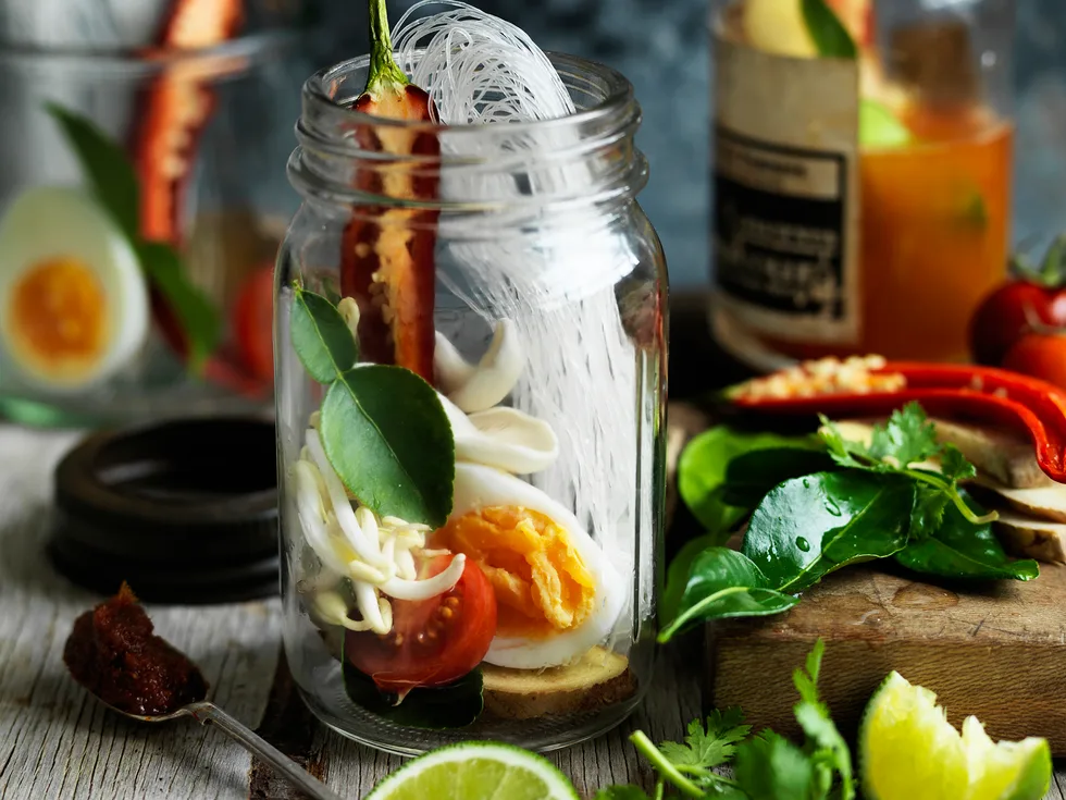 1.Divide eggs, paste, noodles, mushrooms, ginger, lime leaves, tomatoes, sprouts and chilli among four 2 cup (250ml) heatproof jars. Squeeze a lime quarter over ingredients in each jar; add lime to jars.