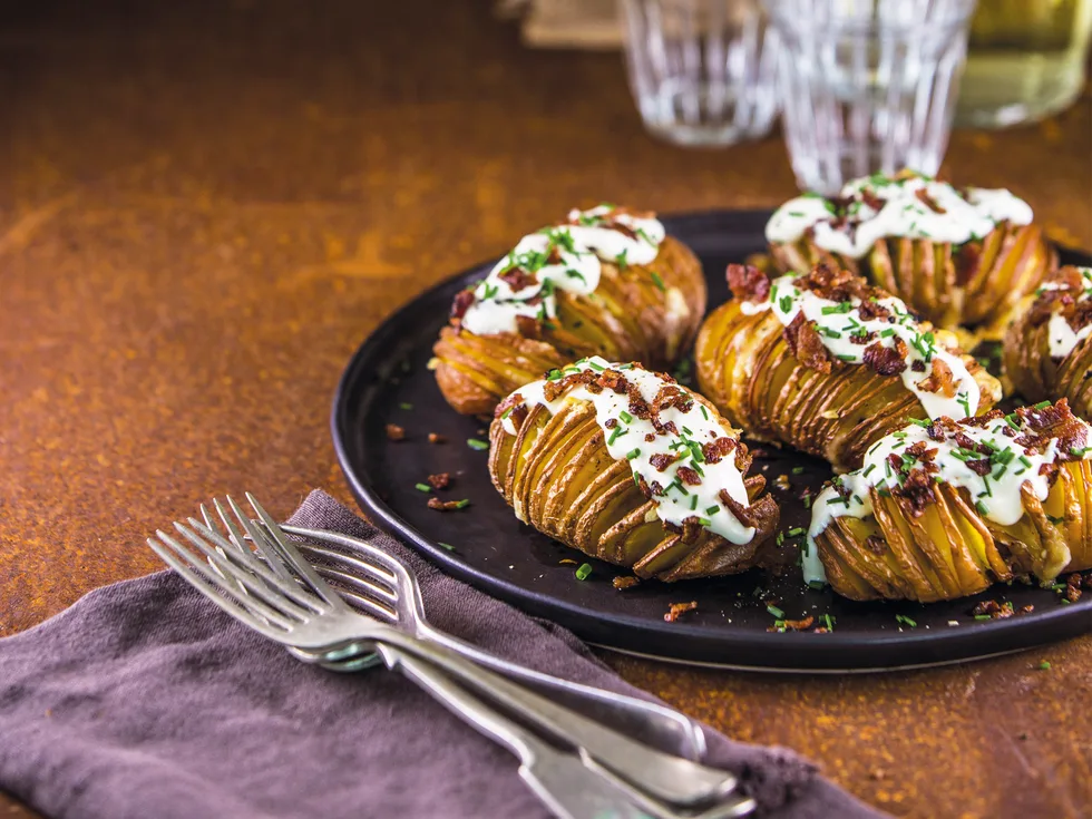 5.Arrange potatoes with slices facing up in a baking dish. Cook for 50 minutes, or until tender with golden edges.