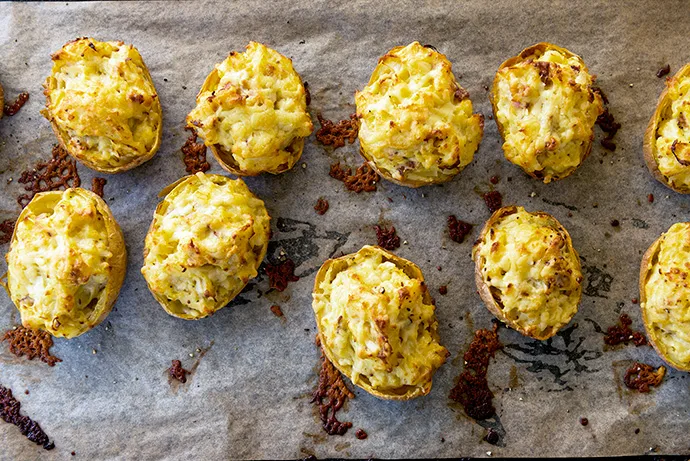 5.Fill potato skins with the mash and top with remaining cheese. Bake in the oven for 15 minutes or until bubbling and golden.