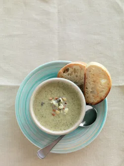 3.Place the soup in the bowl of a food processor and whizz until it is smooth. Stir in the cream and blue cheese. Season to taste with the salt and pepper.